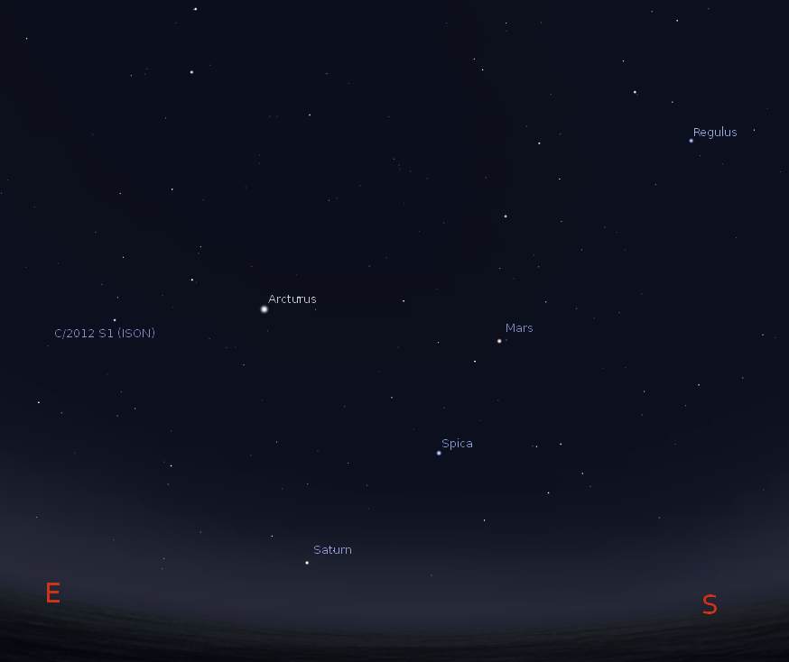Comet Lovejoy finder chart for the next week at 6 a.m. We’re stuck also with the ghost of Comet ISON. Look in the northeast at the constellation Hercules. Created using Cartes du Ciel.