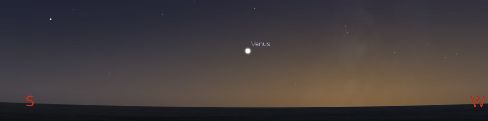 Venus as seen in a telescope at 6 p.m. December 18, 2013. The disk will be blindingly bright with no detail. Created using Stellarium.