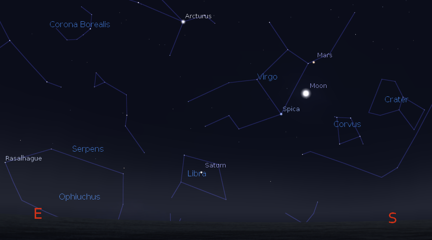 Mars and Saturn among the spring constellations at 6 a.m. December 26, 2013. Created using Stellarium.