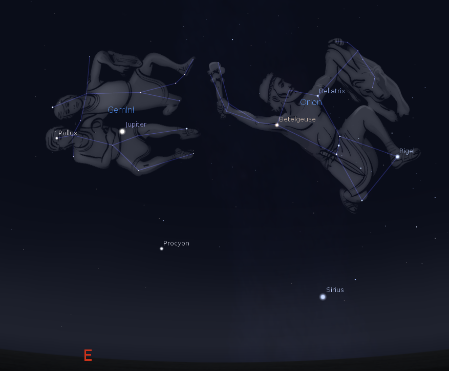 The constellation Gemini, the Twins is visible in the east at 9 p.m. with the bright planet Jupiter interloping against its stars. The namesake stars of the two lads, will be on the left end of the constellation, nearly vertically aligned. Castor is on top, while Pollux, a slightly brighter star is on the bottom. Lines of stars from Castor and Pollux to the right delineate the lads. In Greek mythology Castor and Pollux were twins, and half brothers, Castor was fathered by a mere mortal, while Pollux was fathered by Zeus in the famous Leda and the swan affair. The brothers, however were inseparable, and when Castor was killed during the quest for the Golden Fleece, Pollux pleaded with Zeus to let him die also. Zeus placed them together in the sky forever.