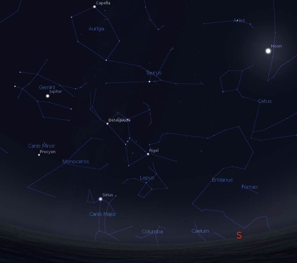 Jupiter, the Moon with the winter constellations at 9 p.m. on January 8, 2014. Created using Stellarium.
