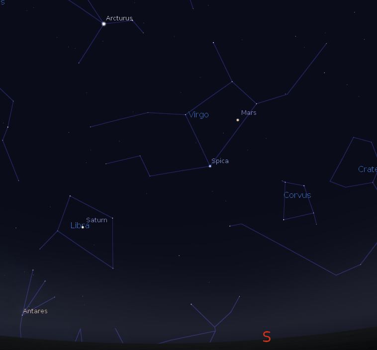 Mars and Saturn with the spring constellations at 6:30 a.m. on January 9, 2014. Created using Stellarium.