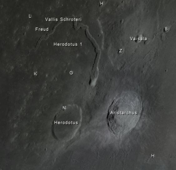 Note the valley that borders Aristarchus, Vallis Schroteri, or Schroter’s Valley.  It’s head is called the Cobra’s Head.  It is up to a kilometer or 3,000 feet deep.
