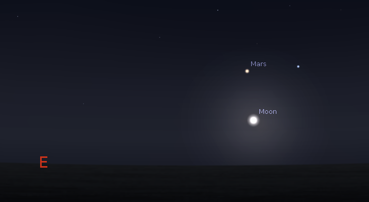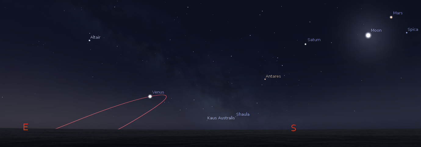Let’s take our weekly look at the planets. Jupiter will be in the southeastern sky as darkness falls tonight. It’s cruising against the stars of Gemini now. It will pass due south at 9:29 p.m., and will set at 5:12 a.m. in the west-northwest. Reddish Mars is in Virgo now and above and left of the bright star Spica, which it now outshines. Mars will rise at 10:54 p.m. and will appear above the moon when it rises a half an hour later. It will pass due south at 4:26 a.m. Saturn will rise at 1:13 a.m. in the east-southeast. It’s seen against the stars of Libra the scales this year. Venus will rise at 5:10 tomorrow morning, and shines brightly in the southeast before sunrise. It’s in Sagittarius, left of its Teapot shape of stars.