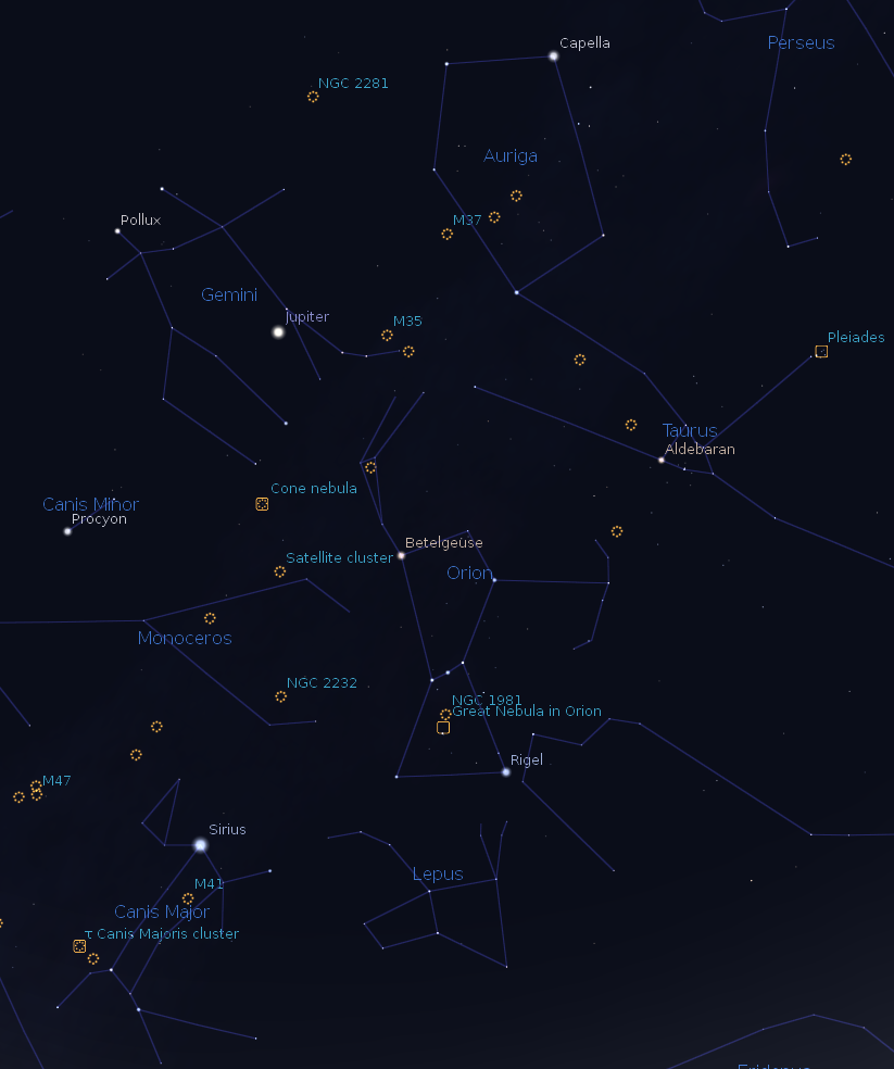 The Milky Way isn’t as bright in the winter as it is in the summer. That’s because we are looking away from the galactic center, the central part of the Milky Way. But there’s still a lot to see as can be attested to by the bright stars of winter that outshine those of summer. There are a lot of Galactic or open star clusters visible, such as the Pleiades. With binoculars one can spot at least two more. Just below Sirius the Dog Star the brightest night-time star which can be found by extending the line of the belt stars of Orion to the lower left. It’s Messier 41. Then off Castor’s toe in Gemini, where the sun would be on the first day of summer, as I mentioned last Tuesday, is another bright binocular star cluster cataloged as Messier 35.