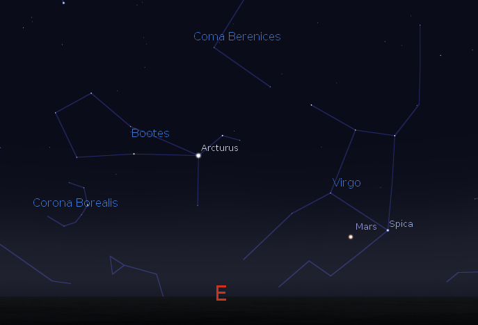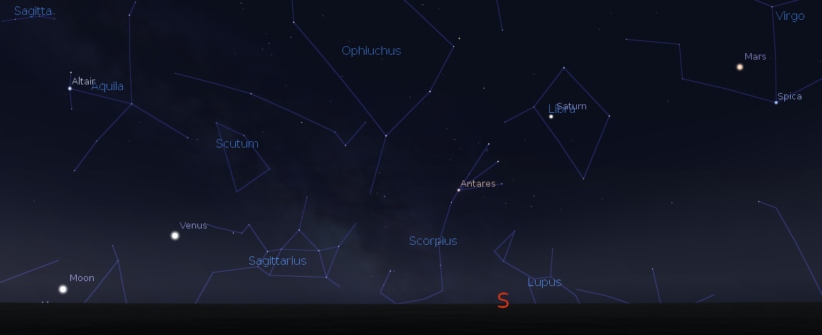 Let’s take our weekly look at the planets. Jupiter will be in the southeastern sky as darkness falls tonight. It’s cruising against the stars of Gemini now. It will pass due south at 9:01 p.m., and will set at 4:44 a.m. in the west-northwest. Reddish Mars is in Virgo now and above and left of the bright star Spica, which it now outshines. Mars will rise at 10:29 p.m. and will appear above the moon when it rises a half an hour later. It will pass due south at 4 a.m. Saturn will rise at 12:45 a.m. in the east-southeast. It’s seen against the stars of Libra the scales this year. Venus will rise at 5:03 tomorrow morning but this morning it will appear above and right of the Moon. and shines brightly in the southeast before sunrise.