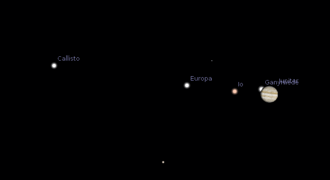 The Stellarium timing is a bit off. Ganymede won’t emerge from behind Jupiter until 9:37 p.m. It will disappear into Jupiter’s shadow at 11:07 p.m. and emerge from the shadow at 1:17 a.m.