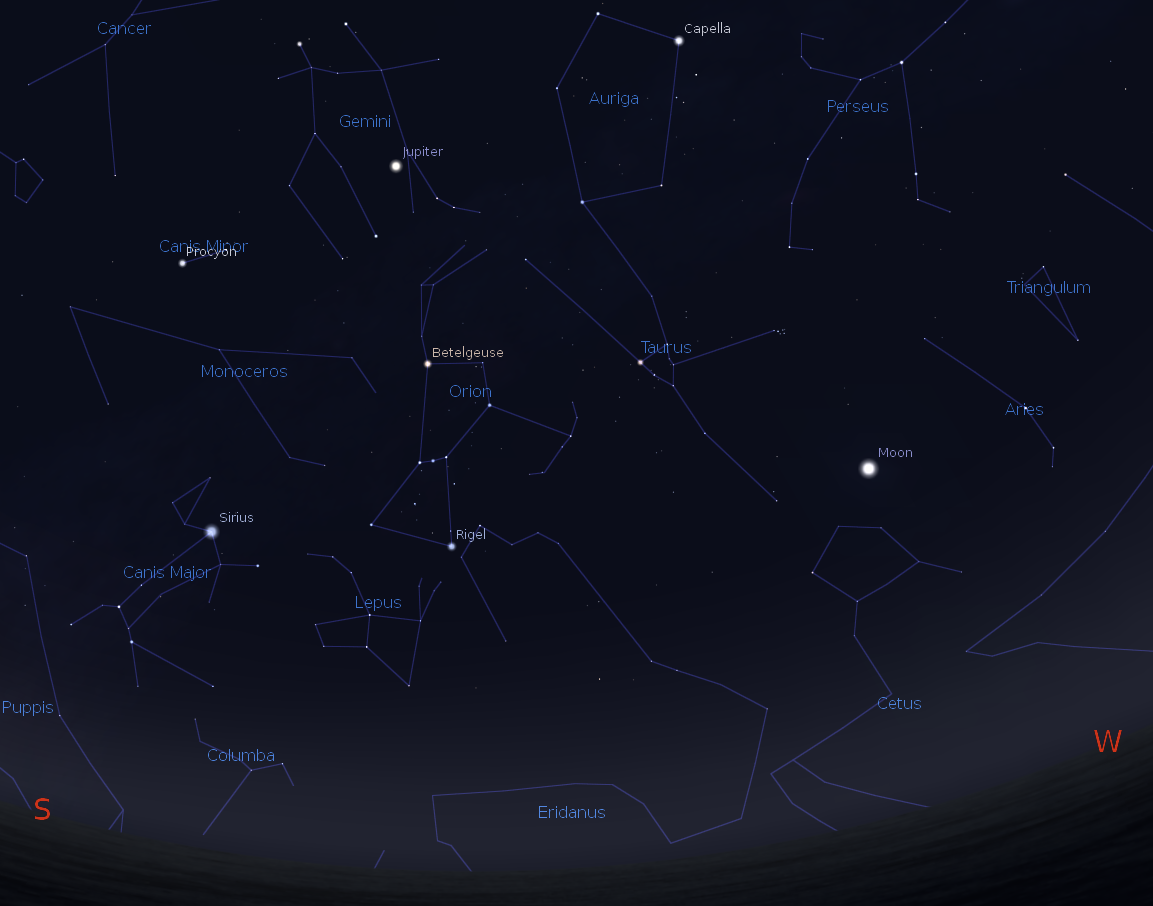 Jupiter, the Moon and the winter constellations at 9 p.m. on March 5, 2014. Created using Stellarium.