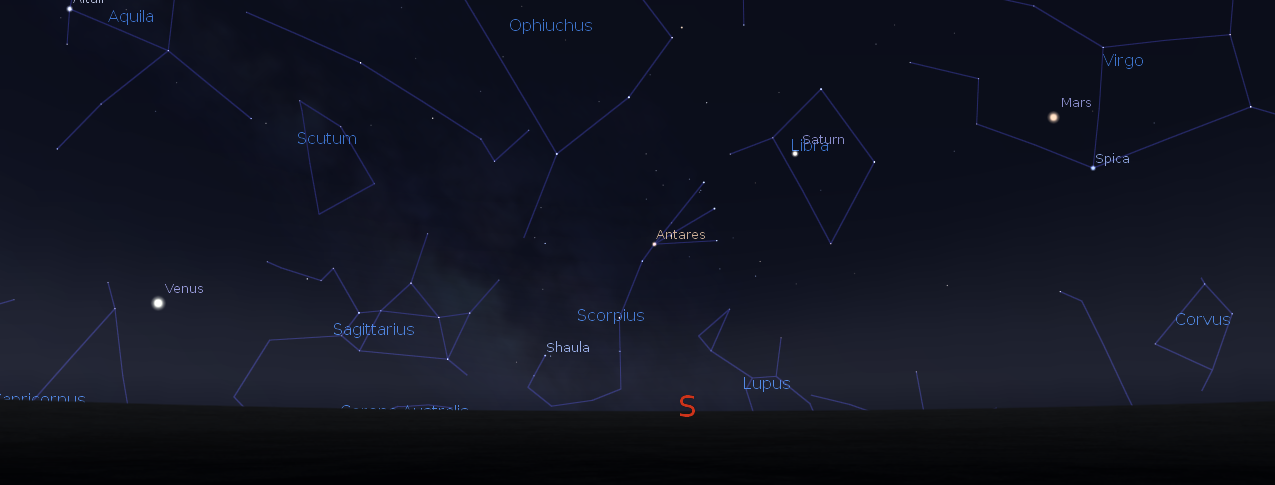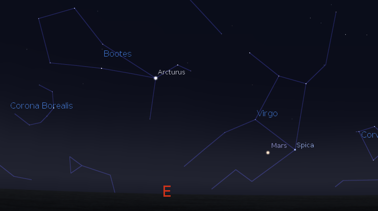 Wednesday is the “Where are the bright planets?” day on Ephemeris. Jupiter will be in the southeastern sky as darkness falls tonight. It’s cruising against the stars of Gemini now. It will pass due south at 8:33 p.m., and will set at 4:16 a.m. in the west-northwest. Reddish Mars is in Virgo now and above and left of the bright star Spica, which it now outshines. Mars will rise at 10:01 p.m. It will pass due south at 3:32 a.m. Saturn will rise at 12:18 a.m. in the east-southeast. It’s seen against the stars of Libra the scales this year. Venus will rise at 4:57 tomorrow morning and shines brightly in the southeast before sunrise.
