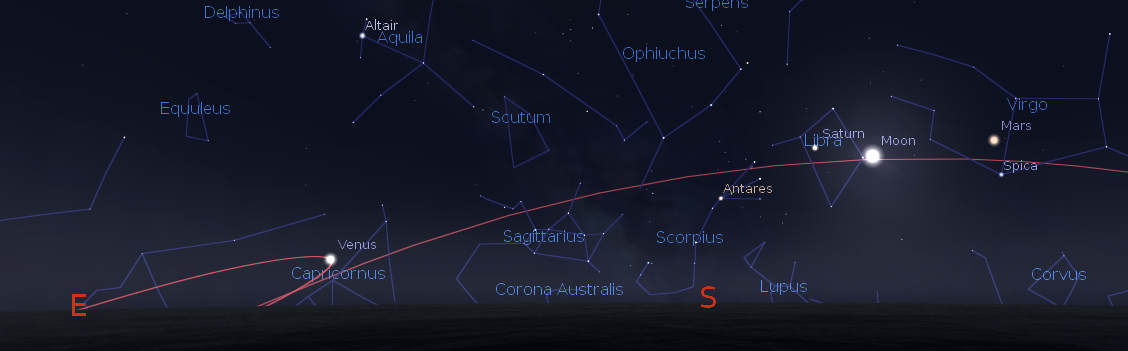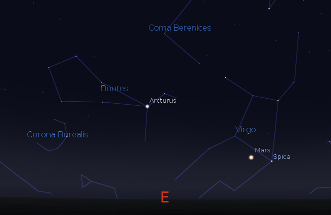 Wednesday is bright planet day on Ephemeris. Jupiter will be in the southern sky as darkness falls tonight. It’s cruising against the stars of Gemini now, and moving east after spending a couple of months backtracking to the west. It will pass due south at 8:39 p.m., and will set at 4:22 a.m. in the west-northwest. Reddish Mars is in Virgo now and left and a bit above bright star Spica in the late evening, which it now outshines. Mars will rise at 9:56 p.m. It will pass due south at 3:29 a.m. Saturn will rise at 12:21 a.m. in the east-southeast. It’s seen against the stars of Libra the scales this year. Venus will rise at 5:48 tomorrow morning and shines brightly in the southeast before sunrise. It will reach its greatest angle from the sun on Saturday.