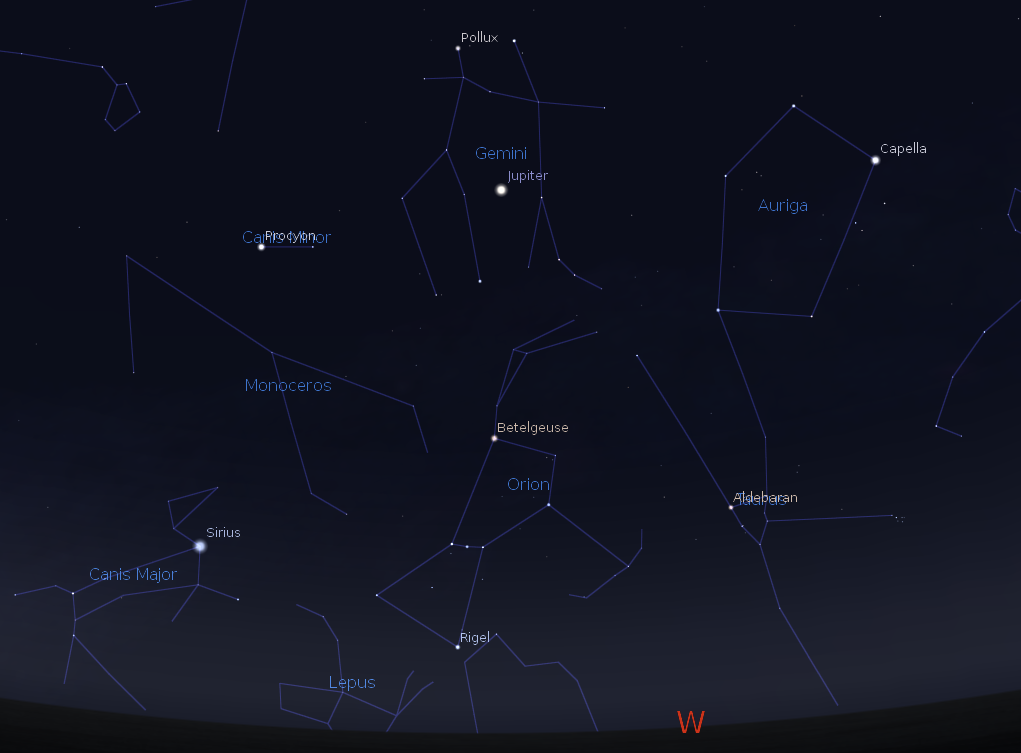 Jupiter and the setting winter constellations in the west at 10 p.m. on April 16, 2014. Created using Stellarium.