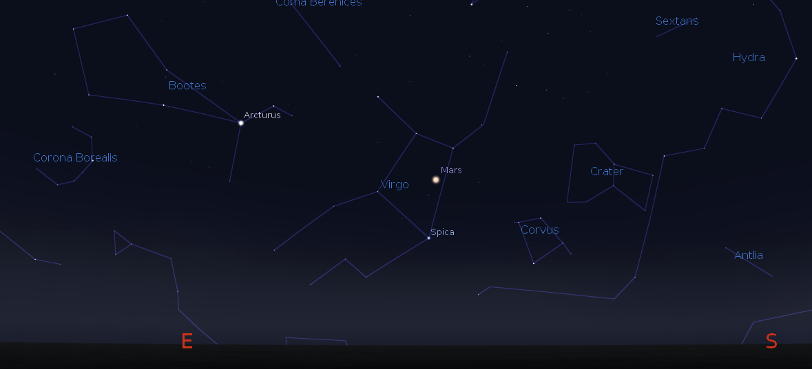 Mars and some low spring constellations in the southeast at 10 p.m. on April 16, 2014. Created using Stellarium.