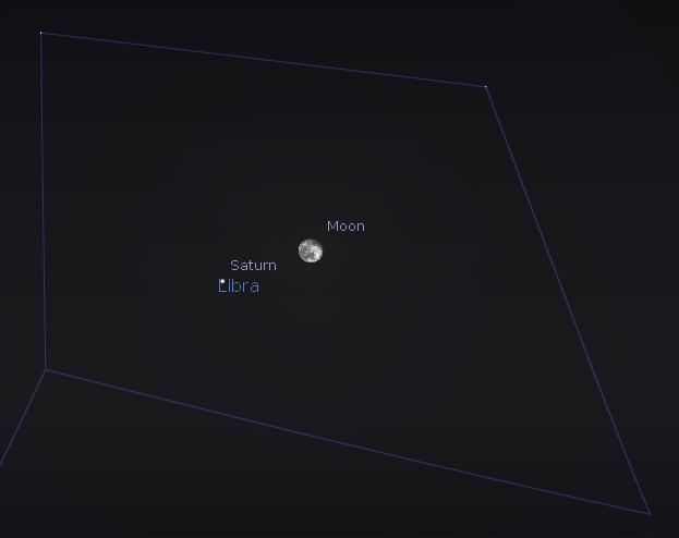 Telescopic Saturn at 11 p.m. April 16, 2014. You may want to wait a bit for it to rise some more for clearer views. Created using Stellarium.