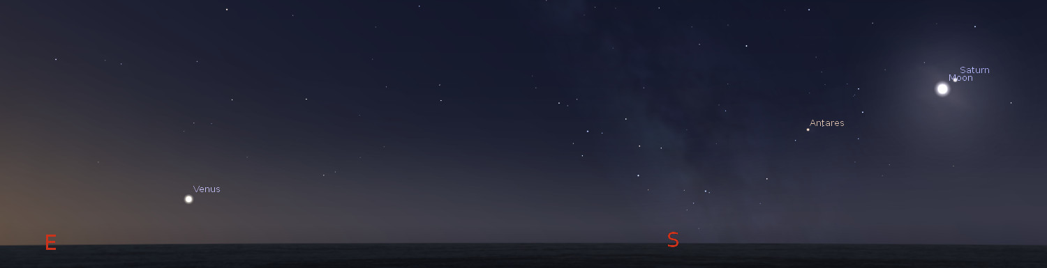 Wednesday is Bright Planets Day, or should I say classical planets day here on Ephemeris. Bright Jupiter will be in the western sky as darkness falls tonight. It will set at 2:42 a.m. Reddish Mars is in Virgo and outshines the bright bluish star Spica below it as darkness falls. Mars is up at sunset in the east. It will pass due south at 1:03 a.m. It’s 57.4 million miles away now, very near its closest. It will set at 6:48 a.m. Saturn will rise at 10:24 p.m. and be seen to the left of the bright moon tonight. It will pass due south at 3:22 a.m. The telescope will bring out Saturn’s beautiful rings, whose short dimension now is as wide as the planet. Brilliant Venus will rise in the east at 5:22 a.m. and will stay pretty low to the horizon.