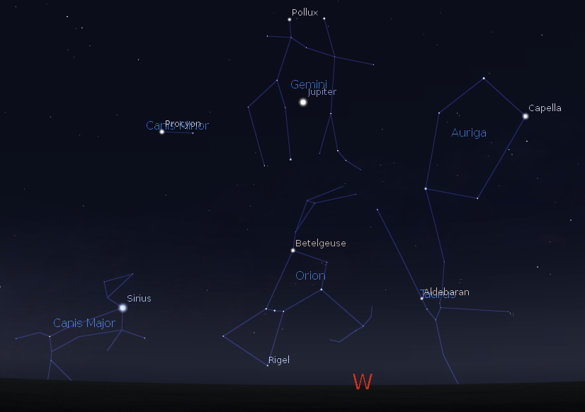 Jupiter and the setting winter constellations in the west at 10 p.m. on April 23, 2014. Created using Stellarium.