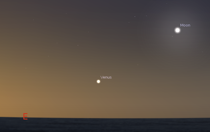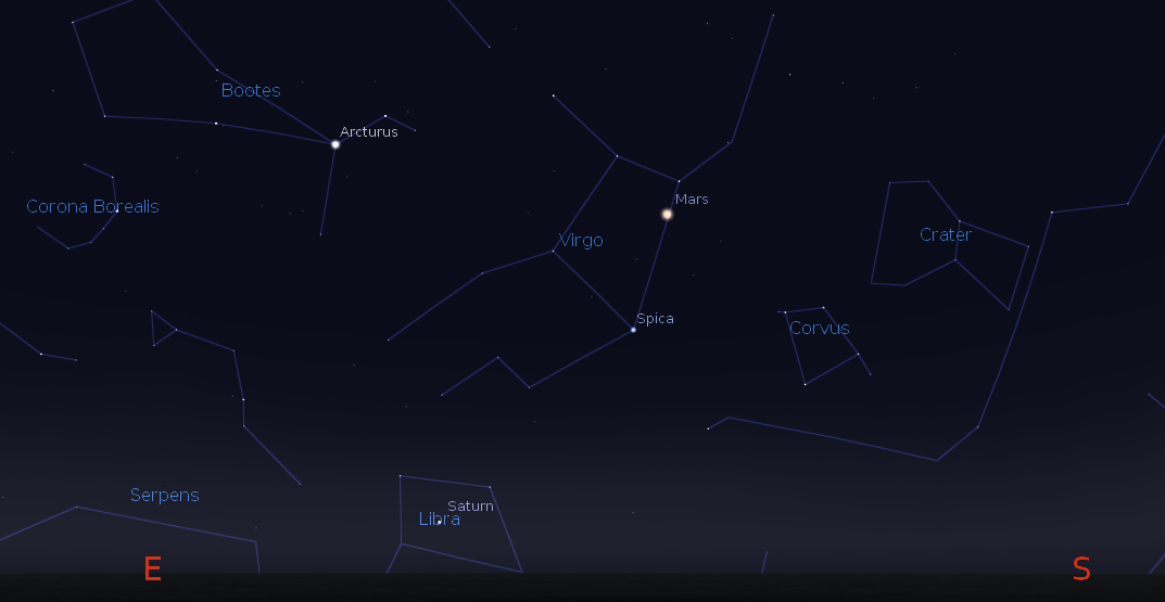 Wednesday is Bright Planets Day, or should I say classical planets day here on Ephemeris. Bright Jupiter will be in the western sky as darkness falls tonight. It will set at 2:17 a.m. Reddish Mars is in Virgo and outshines the bright bluish star Spica below it as darkness falls. Mars is up at sunset in the east. It will pass due south at 12:26 a.m. It’s 58.1 million miles (95.5 million kilometers) away now, and moving away. It will set at 6:14 a.m. Saturn will rise at 9:54 p.m. It’s in the faint constellation of Libra the scales this year. It will pass due south at 2:52 a.m. The telescope will bring out Saturn’s beautiful rings, whose short dimension now is as wide as the planet. Brilliant Venus will rise in the east at 5:14 a.m. and will stay pretty low to the horizon.