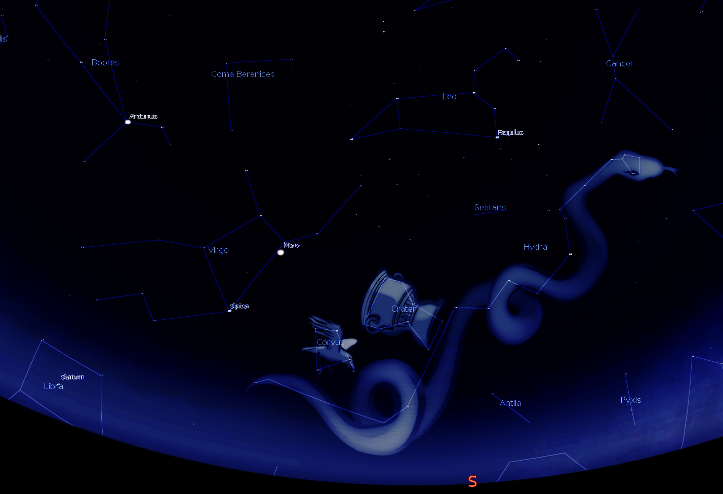 The small constellation of Corvus the crow is located low in the south at 10:30 this evening. It’s made of 5 dim stars, but the pattern is a distinctive distorted box with two stars at the upper left marking that corner. To the right is a fainter constellation of a thick stemmed goblet called Crater. Both appear above the long constellation of Hydra the water snake who is slithering just above the southern horizon. In Greek mythology Corvus, then white, was the god Apollo’s pet. He once bid Corvus to take a cup and fetch him some water. Corvus however dallied and waited for a green fig to ripen. Corvus grabbed a snake and returned with a story on how the snake had delayed him. The angry Apollo turned the crow and all crows to this day black.