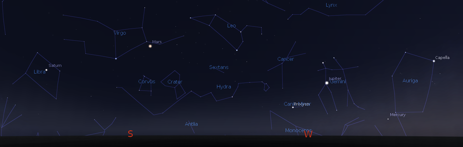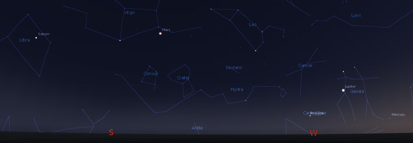 It’s Wednesday and once again time to locate the bright planets for this week. Mercury is showing up in the west shortly after sunset, It will be at its farthest from the Sun on the 25th. It will set at 11:10. Brilliant Jupiter will be in the western sky in Gemini as darkness falls tonight. It will set at 12:44 a.m. Reddish Mars is in Virgo in the southeast as darkness falls. It will pass due south at 10:18 p.m. It’s 68 million miles (109 million km) away now, and moving away, and will set at 4:09 a.m. Saturn will be low in the southeast as darkness falls. It’s in the faint constellation of Libra the scales this year. It will pass due south at 12:54 a.m. Brilliant Venus will rise in the east at 4:37 a.m. in morning twilight.