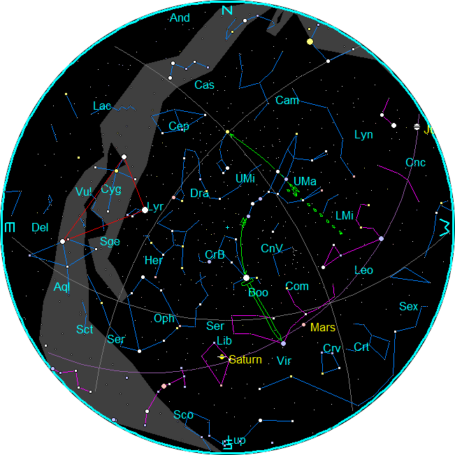 High in the south southeastern sky at 10:30 tonight can be found the kite shaped constellation of Boötes the herdsman, chasing or herding the Great Bear Ursa Major of which the Big Dipper is the hind end, across the sky. The bright star at the base of the kite is the 4th brightest night-time star Arcturus. It can be found and name remembered by first locating the Big Dipper and by following the arc or curve of the handle to Arcturus. This star is an orange-colored giant star, 37 light years away. Its light was used open the 1933 Chicago Worlds Fair believing its light left the star in 1893 the year of the previous Chicago Worlds Fair. It turns out that Arcturus is 3 light years closer than what they thought.