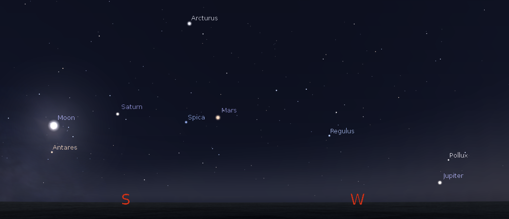 It’s Wednesday and once again time to locate the bright planets for this week. We have lost Mercury to the bright twilight glow, and the fact that it’s getting dimmer as a crescent. Brilliant Jupiter will be in the western sky in Gemini as darkness falls tonight. It’s getting lower each night and will set at 11:36 p.m. tonight. Reddish Mars is in Virgo in the south-southwest as darkness falls. It’s 80 million miles (128 million km) away now, and moving away, and will set at 2:49 a.m. Saturn will be low in the southeast as darkness falls. It’s in the faint constellation of Libra the scales this year. It will pass due south at 11:26 p.m. Brilliant Venus will rise in the east at 4:14 a.m. in morning twilight.