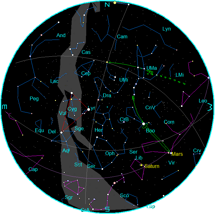 Also shown is the Summer Triangle in red. Clockwise from the top star is Deneb in Cygnus, Vega in Lyra and Altair in Aquila.