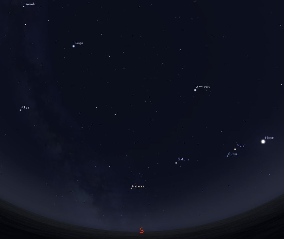 On this patriotic day let’s look for some red, white, and blue stars. Red is easy, the red star Antares is seen in the south at 11 p.m. Mars, the red planet, in the southwest, can be added even though it’s not technically a star. White is easy too, the official white calibration star Vega high in the east at 11 p.m. The blue star is really blue-white. The brightest of these out at 11 p.m. is Spica, low in the southwest. The color is best seen in binoculars. Star colors are quite subtle, and are an indicator of the temperature of their outer gaseous layers. The temperature of a stars outer layers, in order of their increasing temperatures, red, white and blue, is not related to the temperature in their cores. Of these three the coolest on the outside, Antares is really the hottest inside, using helium as fuel.