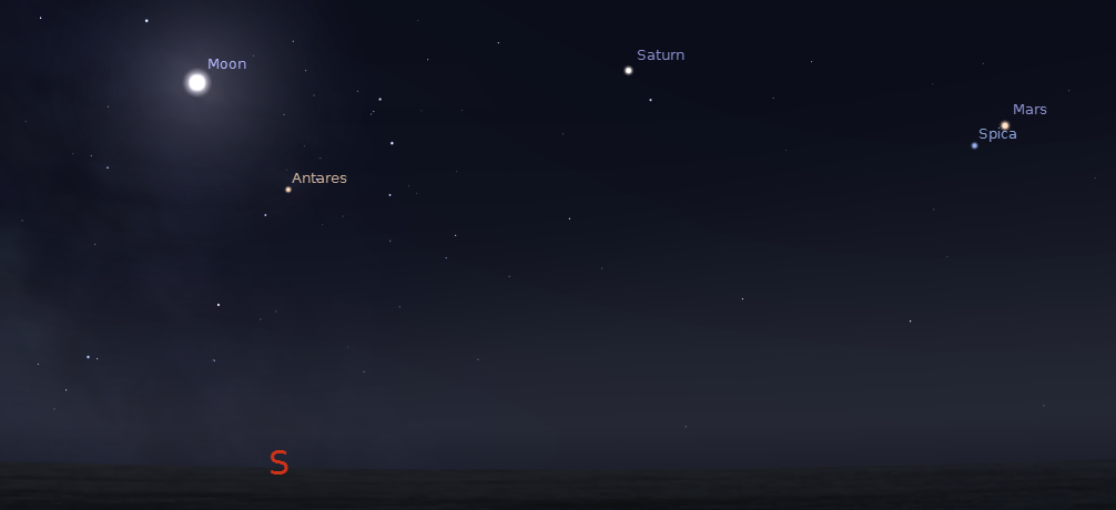 It’s Wednesday and once again time to locate the bright planets for this week. Reddish Mars is in Virgo in the southwest as darkness falls. It’s 101 million miles (163 million km) away now, nearly 2 and a half times farther away than last April, and will set at 12:56 a.m. Saturn will be low in the south-southwest as darkness falls, in the faint constellation of Libra the scales. It will set at 2:06 a.m. Saturn’s in perfect position for viewing with a small or large telescopes to see those fabulous rings and its large moon Titan. Somewhat larger telescopes can spot some smaller moons closer in. Brilliant Venus will rise in the east at 4:14 a.m. in morning twilight. Mercury will rise at 4:46 and be barely visible below Venus.