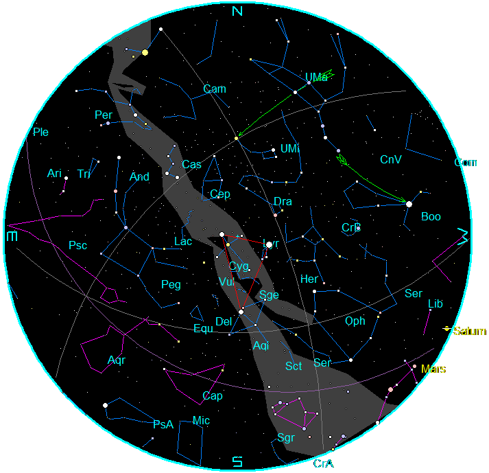 Also shown is the Summer Triangle in red. Clockwise from the top star is Deneb in Cygnus, Vega in Lyra and Altair in Aquila.
