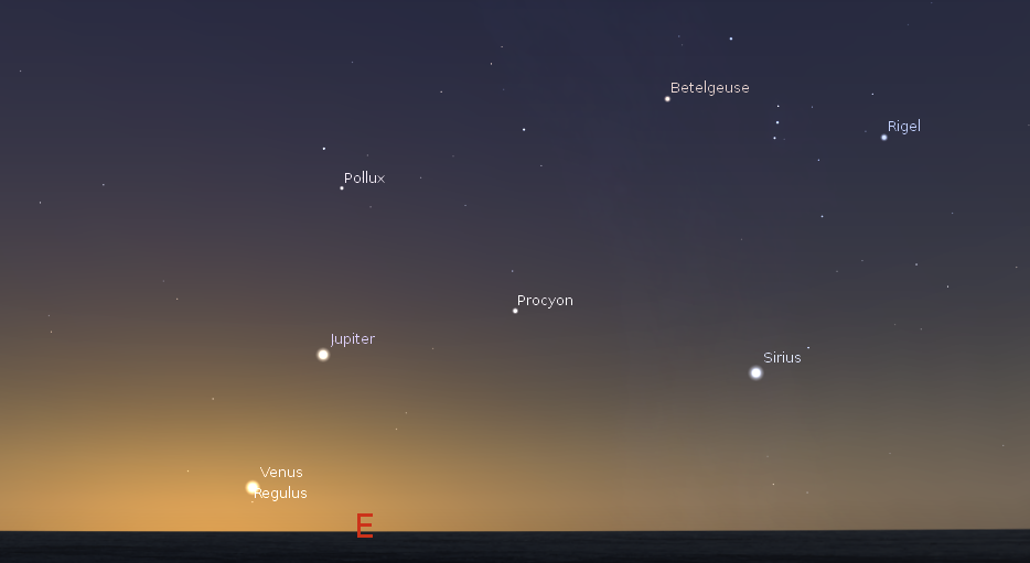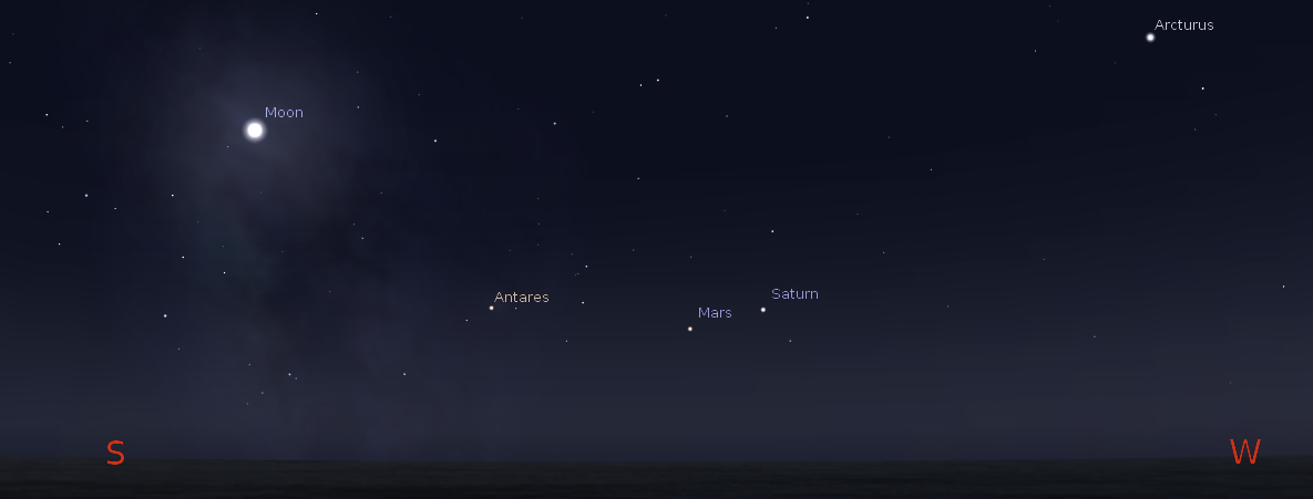 Let’s take our weekly look at the bright planets. Mars and Saturn are now nearly side by side with Saturn to the right by six and a half degrees of about 13 moon widths of the red planet. Saturn will set at 10:57 p.m. Viewing Saturn with a telescope will suffer because it’s getting close to the horizon but it’s still possible to see those fabulous rings and its large moon Titan. Reddish Mars is also in the constellation of Libra the scales and will set at 10:52 p.m. because it is slightly lower than Saturn. In the morning sky brilliant Jupiter will rise in the east-northeast at 4:24 a.m., while the brighter Venus, will rise at 5:53 a.m. Jupiter is increasing its distance from the sun, while Venus is retreating toward the Sun from our point of view.