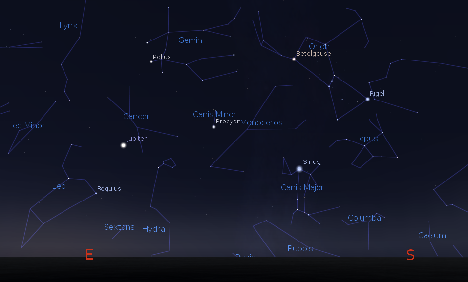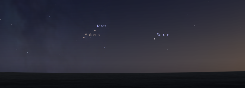 Let’s take our weekly look at the bright planets. Mars and Saturn are in the southwestern sky at 9 p.m. with Saturn to the right and a bit below Mars by 17 degrees, about the two widths of your fist held at arm’s length. Saturn will set at 9:38 p.m. Saturn is in Libra, while Mars is in Scorpius. Mars is closing in on a star that has the identical color, and this year the same brightness, its rival Antares. Indeed that’s what the star’s name means: Ant as in anti, Ares the Greek god of war, and the counterpart of the Roman Mars. They will be closest Saturday. Mars will set at 10:13.. In the morning sky brilliant Jupiter will rise in the east-northeast at 3:23 a.m., while Venus, will rise in the east at 6:51 a.m. only 42 minutes before the sun. I’m not sure you’ll see it.