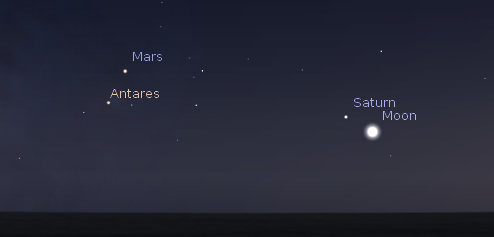 Mars appears its closest to Antares. Here seen low in the southwest at 8:30 p.m. on September 27, 2014. The Moon, near Saturn is too small to show a phase. Created using Stellarium.