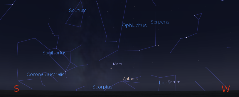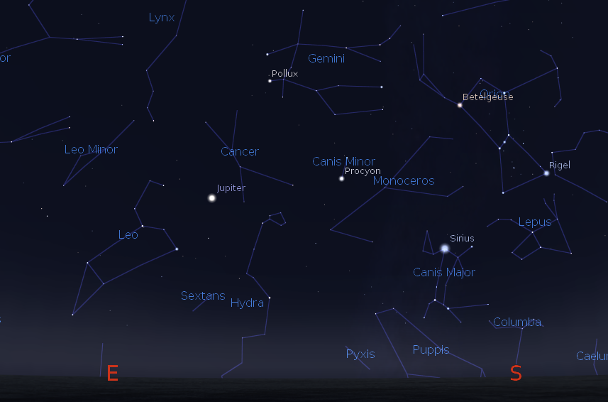 There is a lunar eclipse occurring right now. Totality is either about to start or the moon is in totality with an orange or reddish hue, depending on when you hear this. You can see it right now in the west, if it’s reasonably clear. Totality will end at 7:24. The ending partial phase will be interrupted by moon setting near 8 a.m. Tonight Saturn will be low in the west-southwest before it sets at 8:47 p.m. Mars will be low in the southwest at 9 p.m. and will set at 9:54 p.m. The sky will stay devoid of bright planets until Jupiter rises, which it will do at 2:40 a.m. tomorrow morning. Jupiter is visible this morning in twilight in the south-southeast along with the brighter stars of winter visible, a preview of colder evenings to come.