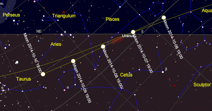 The Hunters/Harvest Moon effect for 2014. Note the shallowness of the Moon’s path. Created using Cartes du Ciel (Sky Charts).