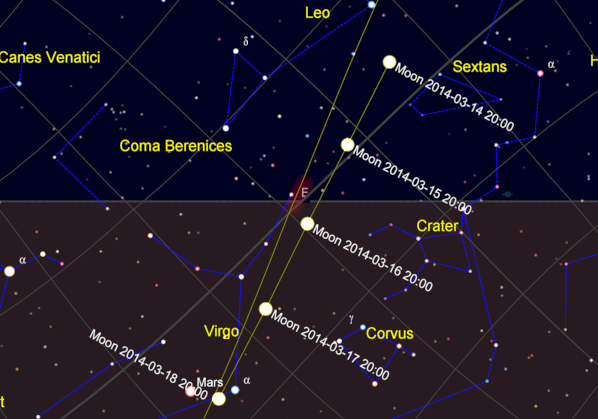 Note that the brown shading on the bottom of the images is below the horizon. The yellow line is the ecliptic or plane of the Earth’s orbit. The motion of all the objects in the sky due to the Earth’s rotation is to the upper right parallel to the celestial equator line that crosses the horizon below the E or east compass point. The red smudge on the ecliptic is the display of the Earth’s shadow for the 5 days of the display. Note in the top image that early on October 8th the Moon passes through the Earth’s shadow, which gave us the lunar eclipse that morning. On the Worm Moon image the Moon misses the Earth’s shadow. However you can see that the Moon is tracking toward the ecliptic. The next month on April 15th, the Moon did indeed pass through the earth’s shadow, giving us a lunar eclipse that morning.