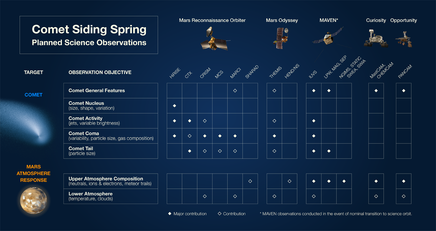 Planned science observations of Comet Siding Spring by NASA spacecraft and rovers at Mars. Credit: NASA.