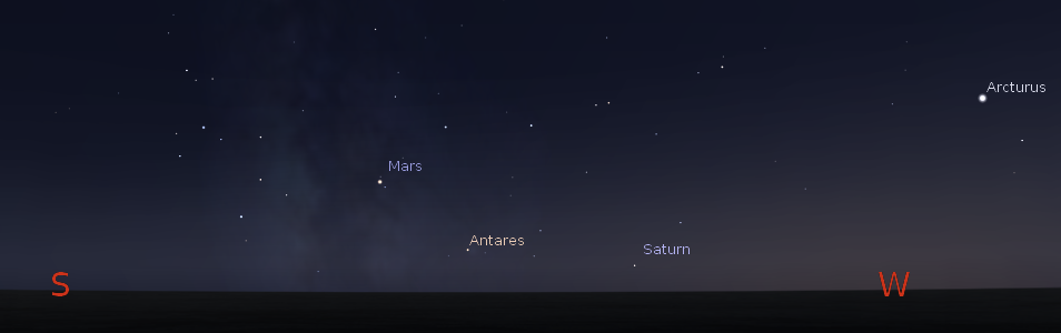 Saturn and Mars low near the setting southern summer stars at 8 p.m. October 15, 2014. Created using Stellarium.