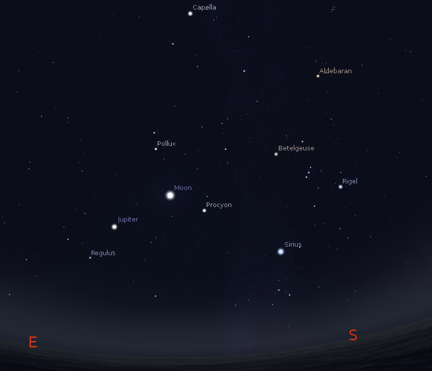 Jupiter and the Moon among the stars of winter at 6 a.m. October 16, 2014. Created using Stellarium.