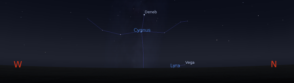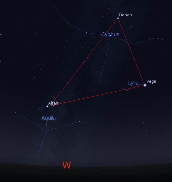Well it’s almost Thanksgiving and about time that the Summer Triangle of bright summer stars finally set. Except it won’t go just yet. The stars Vega, Altair and Deneb are still hanging around in the west. The bright summer part of the Milky Way is gone. The constellations the three stars are in are Altair in Aquila the Eagle, now flying vertically up, Deneb in Cygnus the swan flying vertically down, and Vega in Lyre the harp, lying on its side. Altair the southernmost of these three will set first, later Vega will also set. What happens to Deneb depends on your location in the Interlochen Public Radio area. It you are north of Traverse City, Deneb will not actually set over Lake Michigan’s northern horizon.