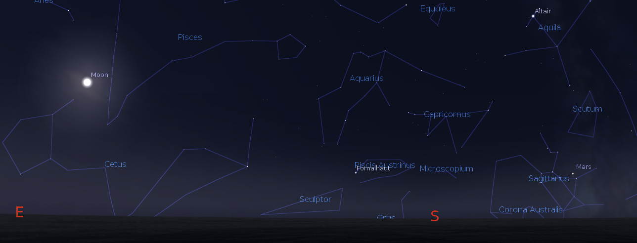Tonight Mars will be low in the southwest at 7 p.m. It will set at 8:32 p.m. The sky will stay devoid of bright planets until Jupiter rises at 12:13 a.m. Jupiter is visible this morning in twilight an hour earlier than last week, in the south-southeast along with the brighter stars of winter, a preview of colder evenings to come. The planet Mercury is making its autumn morning appearance now, rising in the east-southeast at 5:48 a.m. By 6:20 or so it should be visible low in the sky. Mercury is brightening as moves away from us and its phase becomes fuller. Being close in to the sun its distance doesn’t vary by much so its brightness is governed more by its phase. Its separation from the sun is now an 18 degree angle and slowly decreasing.