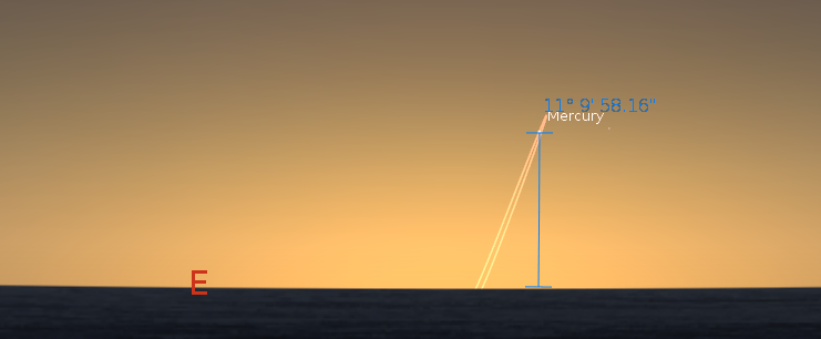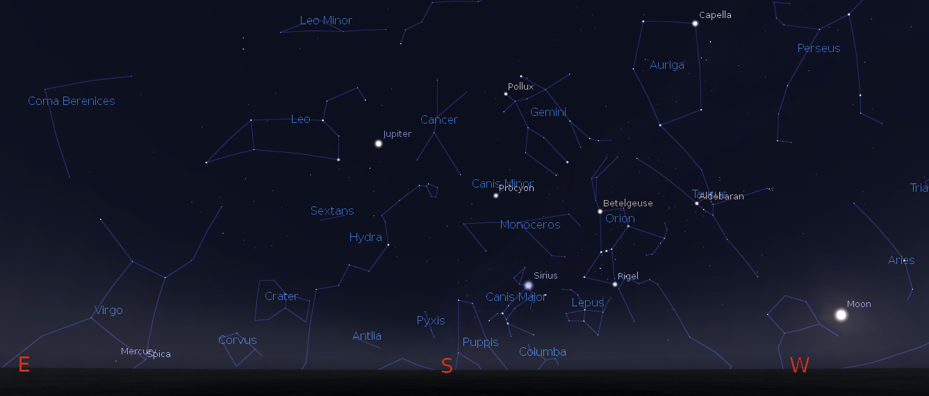 Panorama of the morning sky at 6 a.m. with Jupiter and the just risen Mercury, with the Moon hanging on in the west. Created using Stellarium.