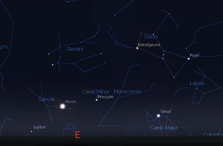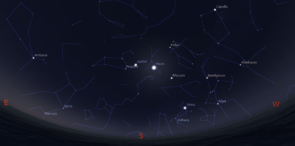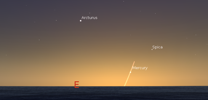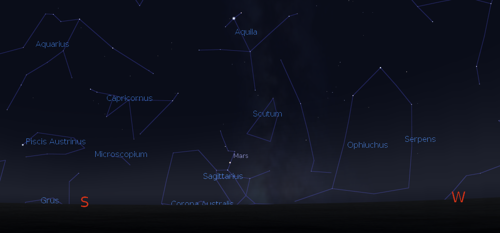 Tonight Mars will be low in the southwest at 7 p.m. It will set at 8:30 p.m. Jupiter now rises before midnight at 11:45 p.m. The best telescopic views will have to wait a couple of hours. Better to view Jupiter in the morning. The planet Mercury is making its autumn morning appearance now, rising in the east-southeast at 6:19 a.m. By 6:45 or so it should be visible low in the eastern sky, below and left of the star Spica, of about the same brightness, but has a bluish tinge in binoculars. Mercury is brightening as moves away from us and its phase appears fuller. Being close in to the sun its distance doesn’t vary by much so its brightness is governed more by its phase. Its separation from the sun is now down to 14.5 degrees.