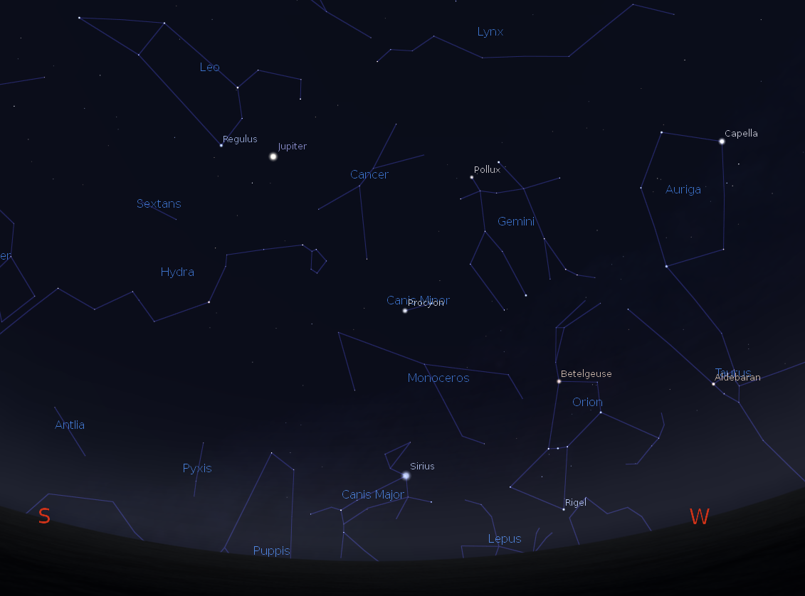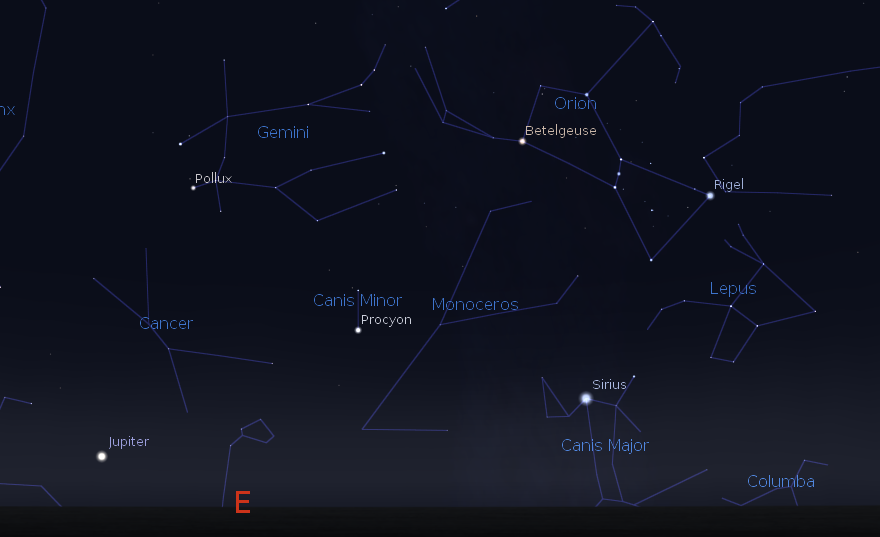 Jupiter rising with the winter constellations at 11:30 p.m. on November 26, 2014. Created using Stellarium.