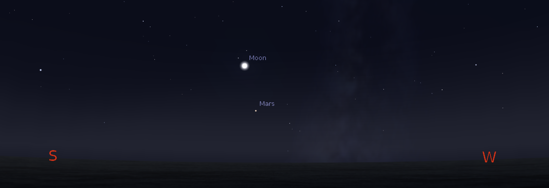 In reviewing which planets are visible tonight, it looks like we’re down to two. Venus, Saturn and Mercury are hanging around near the direction of the Sun. It will be a while before we see them again. However we can see Mars, which will be low in the southwest at 7 p.m. It will set at 8:29 p.m. Mars’ setting time will slowly advance only 6 minutes between now and the end of the year. Jupiter will rise at 10:54 p.m. in the east-northeast. The best telescopic views will have to wait a couple of hours after that. So if you’re more of an early bird rather than a night owl it might be better to view Jupiter with a telescope in the morning. Jupiter has those four bright moons that change position daily, and sometimes while you watch.