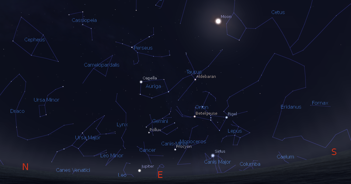 Jupiter rising with the winter constellations at 11 p.m., December 3, 2014. We’re actually looking at the eastern half of the sky. Created using Stellarium.