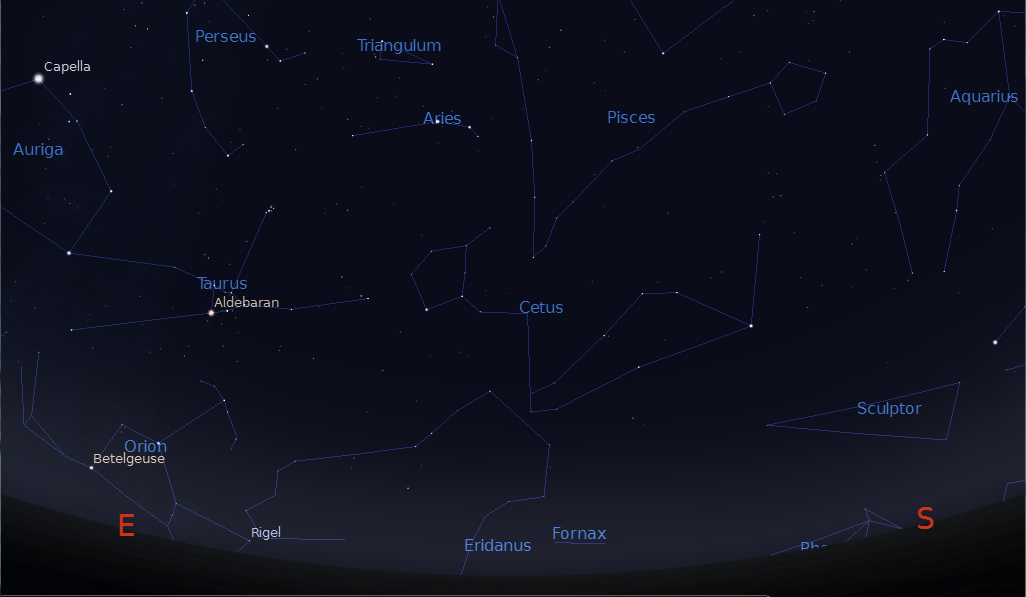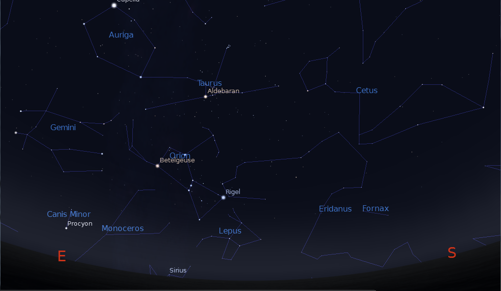 At 7 p.m. tonight the great central constellation of winter Orion is struggling to rise, with the top half of him in the eastern sky. By 9 p.m. he’s whole and low in the east-southeast. By midnight he has taken his rightful place as the central winter constellation. In the evening now his distinctive belt of three stars in a straight line, by which most folks can find him, is more or less vertical in the sky. His brightest stars are Betelgeuse a red star to the left of the belt and blue-white Rigel to the right. When Orion’s the highest in the south we’ll explore the wonders within this constellation, the most famous constellation world over. Parts of it can be seen at the north and south poles of the Earth. The Big Dipper, which isn’t a real constellation, doesn’t hold a candle to it.