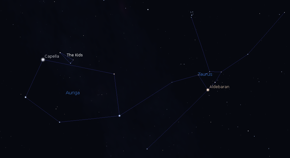 Tuesday I talked about the bright star Capella in the constellation Auriga the charioteer, the brightest star in the eastern sky until Jupiter rises around 9:30. I mentioned a slim triangle of stars called the Kids, offspring of the mama goat Capella. The star at the tip of that slim triangle is designated by the Greek letter epsilon and so in known as Epsilon Aurigae. It was discovered to be variable in brightness in 1821. It turns out to be an eclipsing binary, where stars eclipse each other. Only the period between eclipses is 27 years, and the eclipses last about 2 years. Typical eclipsing binary stars have periods of days and the eclipses last hours. The eclipsing star has a large debris ring around it that’s also eclipsing the other star.