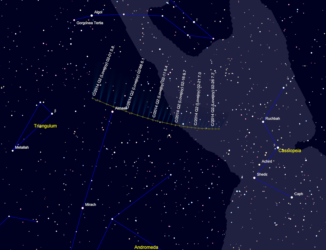 Comet C/2014 Q2 (Lovejoy) will be fading fast throughout February as it moves from Andromeda to Cassiopeia.