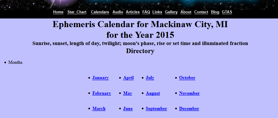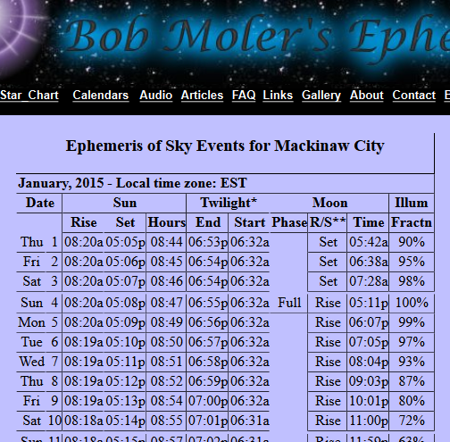Partial image of the January calendar for Mackinaw City. The last column illum Fractn is the moon’s illuminated fraction. It is set for 24h UT, which is early evening on the date listed.