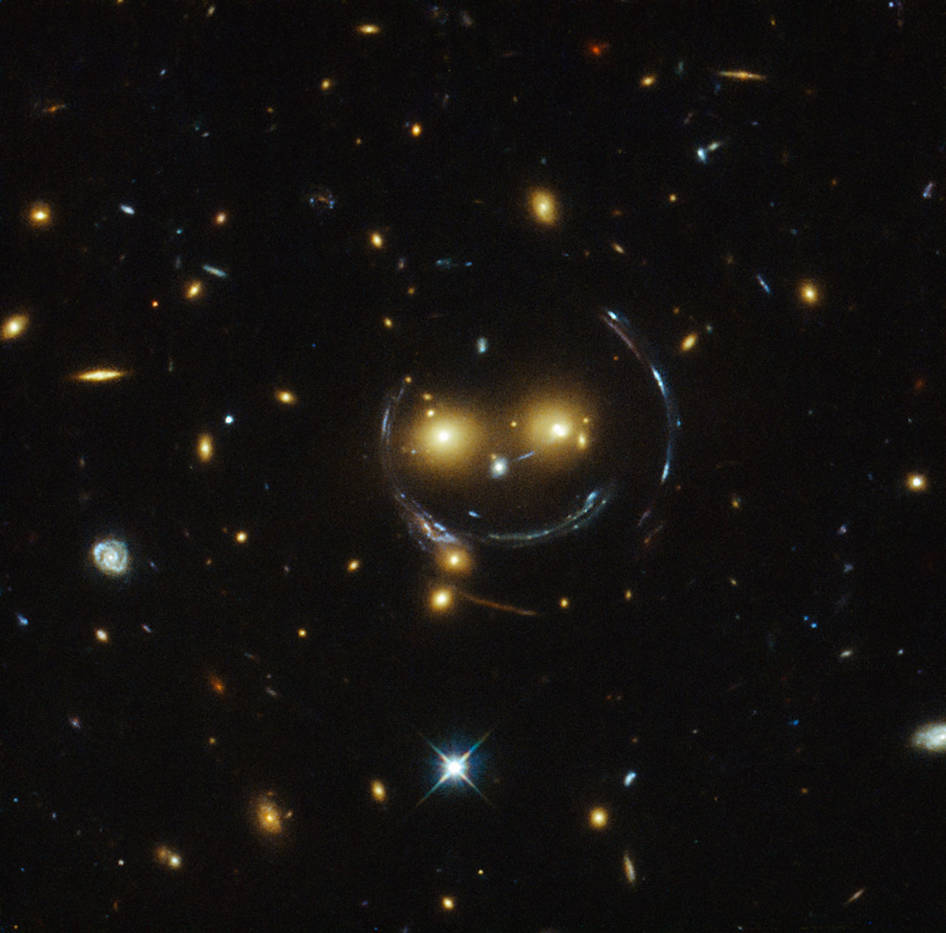 In the centre of this image, taken with the NASA/ESA Hubble Space Telescope, is the galaxy cluster SDSS J1038+4849 — and it seems to be smiling. You can make out its two orange eyes and white button nose. In the case of this “happy face”, the two eyes are very bright galaxies and the misleading smile lines are actually arcs caused by an effect known as strong gravitational lensing. Galaxy clusters are the most massive structures in the Universe and exert such a powerful gravitational pull that they warp the spacetime around them and act as cosmic lenses which can magnify, distort and bend the light behind them. This phenomenon, crucial to many of Hubble’s discoveries, can be explained by Einstein’s theory of general relativity. In this special case of gravitational lensing, a ring — known as an Einstein Ring — is produced from this bending of light, a consequence of the exact and symmetrical alignment of the source, lens and observer and resulting in the ring-like structure we see here. Hubble has provided astronomers with the tools to probe these massive galaxies and model their lensing effects, allowing us to peer further into the early Universe than ever before. This object was studied by Hubble’s Wide Field and Planetary Camera 2 (WFPC2) and Wide Field Camera 3 (WFC3) as part of a survey of strong lenses. A version of this image was entered into the Hubble’s Hidden Treasures image processing competition by contestant Judy Schmidt.
