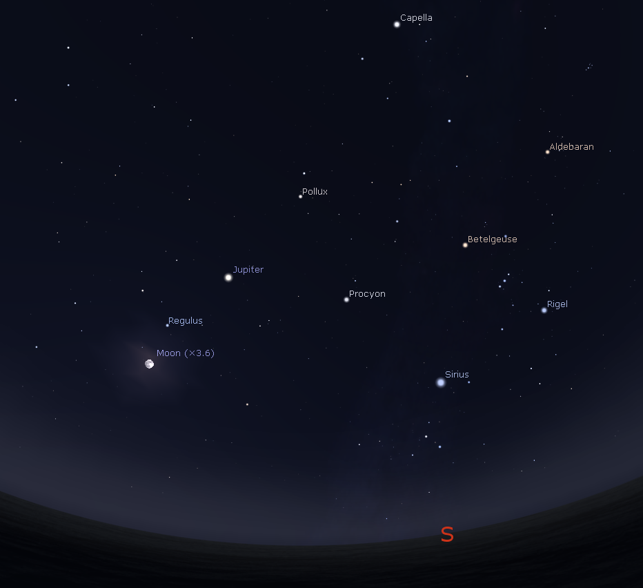 Jupiter and moons at 9:39 p.m., when Io leaves Jupiter’s shadow on March 4, 2015. Created using Cartes du Ceil (Sky Charts).